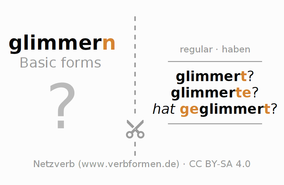 Worksheets are used generally for the conjugation of the verb glimmern in teaching. The materials can be used as Open Educational Resources (OER) for exercises, for games and as Tasks (CC BY-SA 4.0). There are many different types of tasks available for the verb glimmern. These are overview sheets with complete conjugation, puzzles and games that require joint learning. The entire educational material is available for free as a PDF download, as pictures and as an interactive browser version. In addition to the tasks, countless examples for glimmern also provide an aid to using the verb.