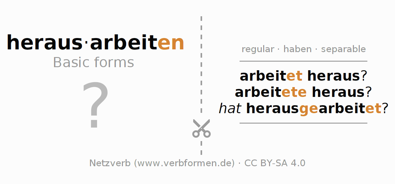 Worksheets are used generally for the conjugation of the verb herausarbeiten in teaching. The materials can be used as Open Educational Resources (OER) for exercises, for games and as Tasks (CC BY-SA 4.0). There are many different types of tasks available for the verb herausarbeiten. These are overview sheets with complete conjugation, puzzles and games that require joint learning. The entire educational material is available for free as a PDF download, as pictures and as an interactive browser version. In addition to the tasks, countless examples for herausarbeiten also provide an aid to using the verb.
