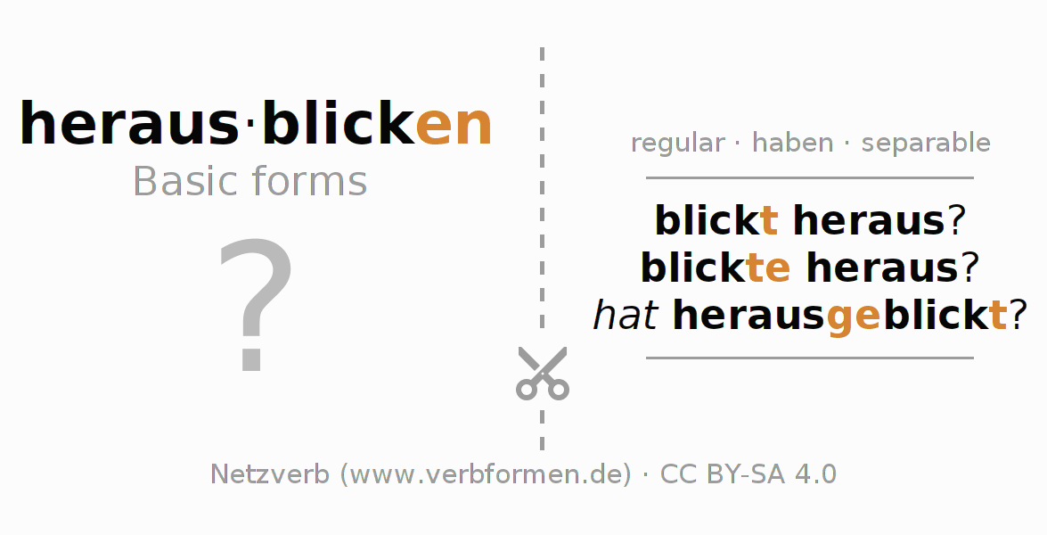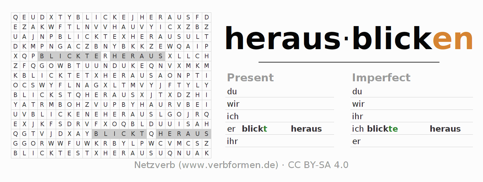 Worksheets are used generally for the conjugation of the verb herausblicken in teaching. The materials can be used as Open Educational Resources (OER) for exercises, for games and as Tasks (CC BY-SA 4.0). There are many different types of tasks available for the verb herausblicken. These are overview sheets with complete conjugation, puzzles and games that require joint learning. The entire educational material is available for free as a PDF download, as pictures and as an interactive browser version. In addition to the tasks, countless examples for herausblicken also provide an aid to using the verb.