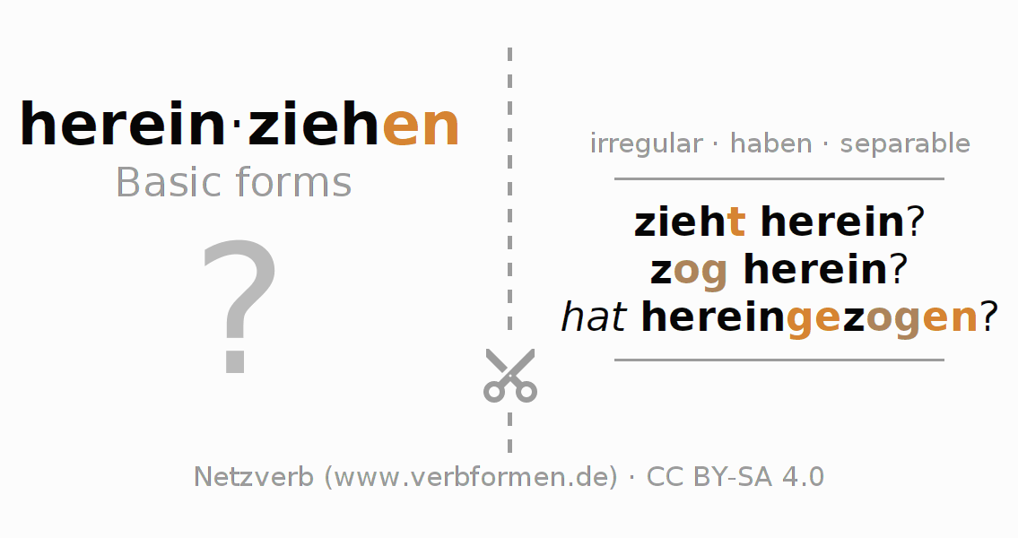 Worksheets are used generally for the conjugation of the verb hereinziehen in teaching. The materials can be used as Open Educational Resources (OER) for exercises, for games and as Tasks (CC BY-SA 4.0). There are many different types of tasks available for the verb hereinziehen (hat). These are overview sheets with complete conjugation, puzzles and games that require joint learning. The entire educational material is available for free as a PDF download, as pictures and as an interactive browser version. In addition to the tasks, countless examples for hereinziehen also provide an aid to using the verb.