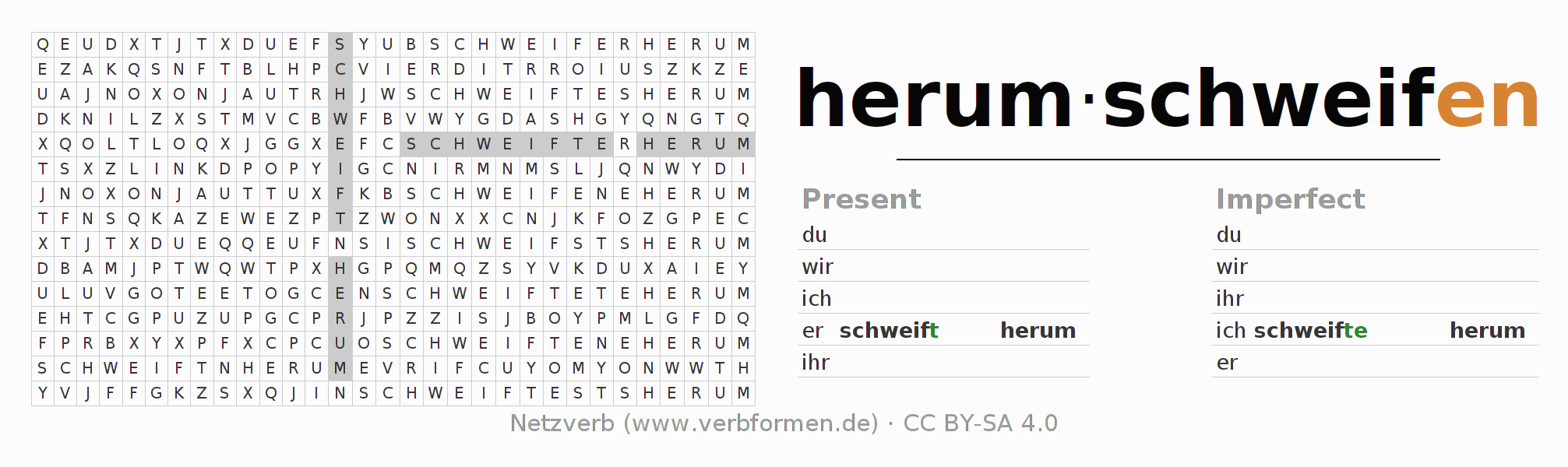 With these search word puzzles you can learn the conjugation of the German verb herumschweifen.