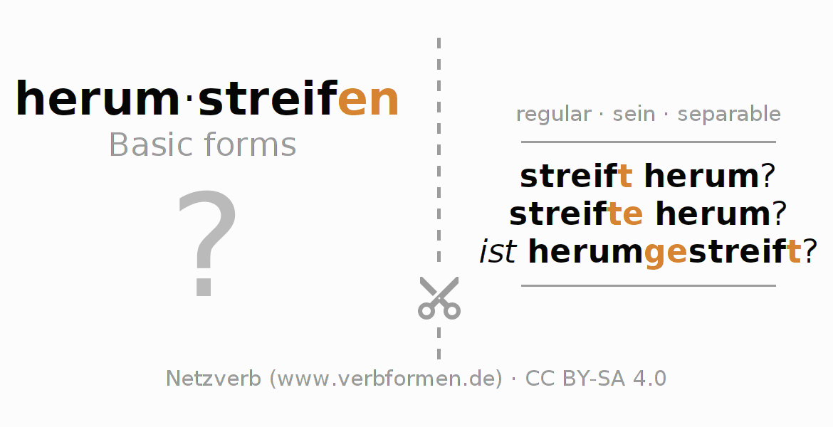Worksheets are used generally for the conjugation of the verb herumstreifen in teaching. The materials can be used as Open Educational Resources (OER) for exercises, for games and as Tasks (CC BY-SA 4.0). There are many different types of tasks available for the verb herumstreifen. These are overview sheets with complete conjugation, puzzles and games that require joint learning. The entire educational material is available for free as a PDF download, as pictures and as an interactive browser version. In addition to the tasks, countless examples for herumstreifen also provide an aid to using the verb.