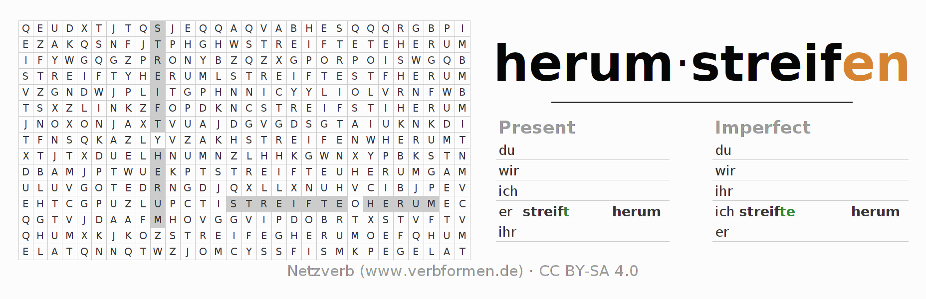 With these search word puzzles you can learn the conjugation of the German verb herumstreifen.