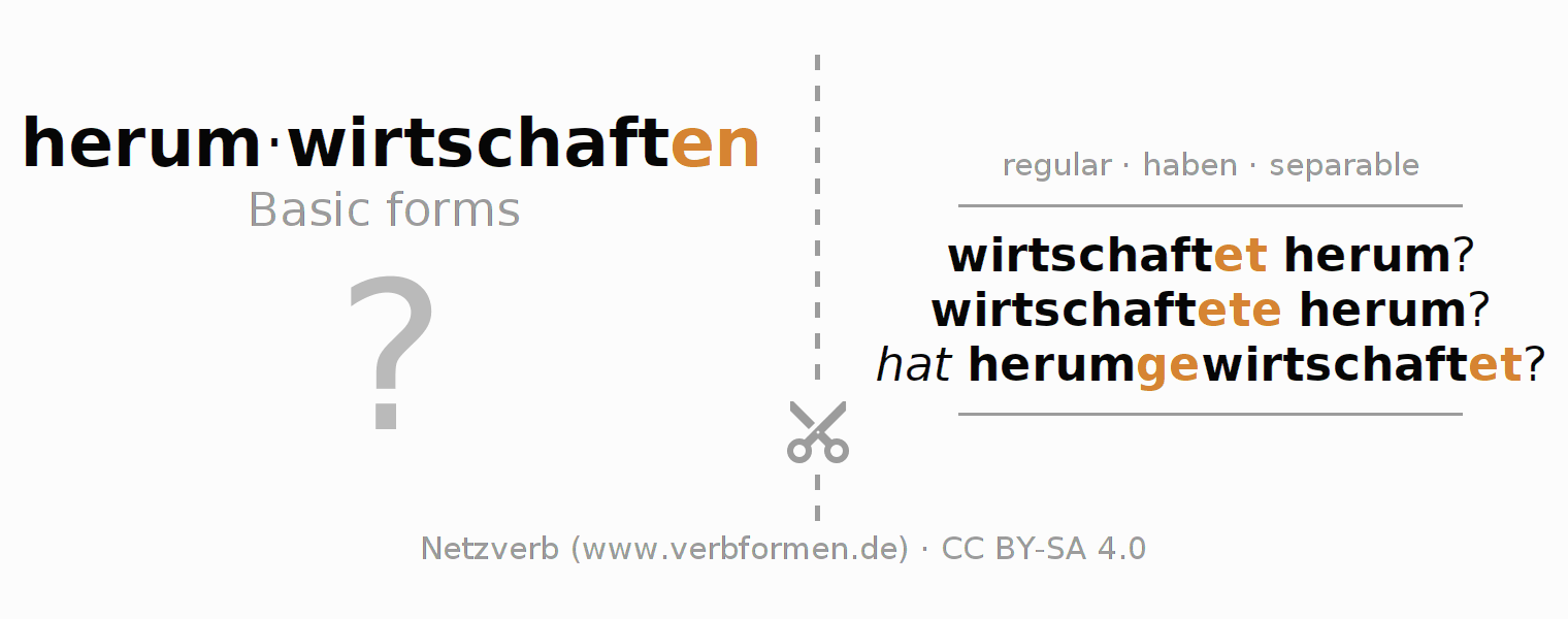 Worksheets are used generally for the conjugation of the verb herumwirtschaften in teaching. The materials can be used as Open Educational Resources (OER) for exercises, for games and as Tasks (CC BY-SA 4.0). There are many different types of tasks available for the verb herumwirtschaften. These are overview sheets with complete conjugation, puzzles and games that require joint learning. The entire educational material is available for free as a PDF download, as pictures and as an interactive browser version. In addition to the tasks, countless examples for herumwirtschaften also provide an aid to using the verb.