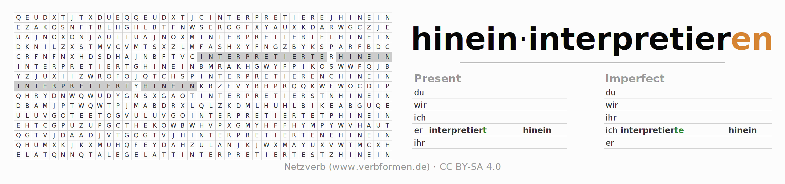 With these search word puzzles you can learn the conjugation of the German verb hineininterpretieren.