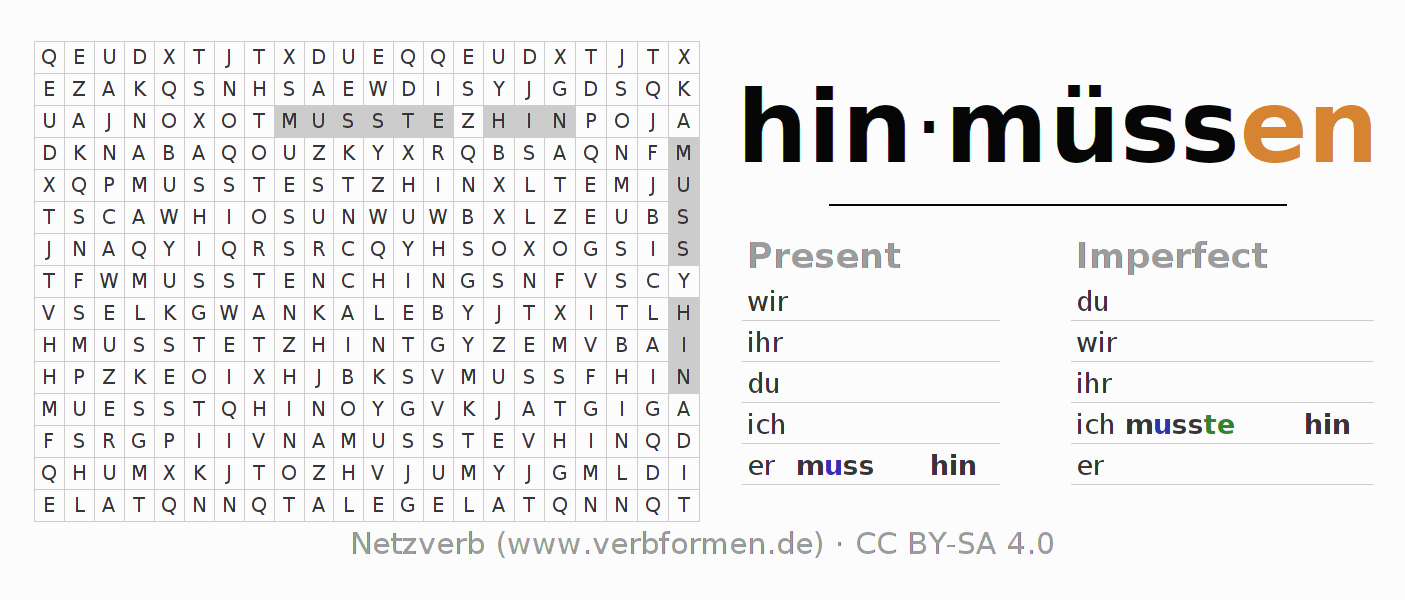 With these search word puzzles you can learn the conjugation of the German verb hinmüssen.