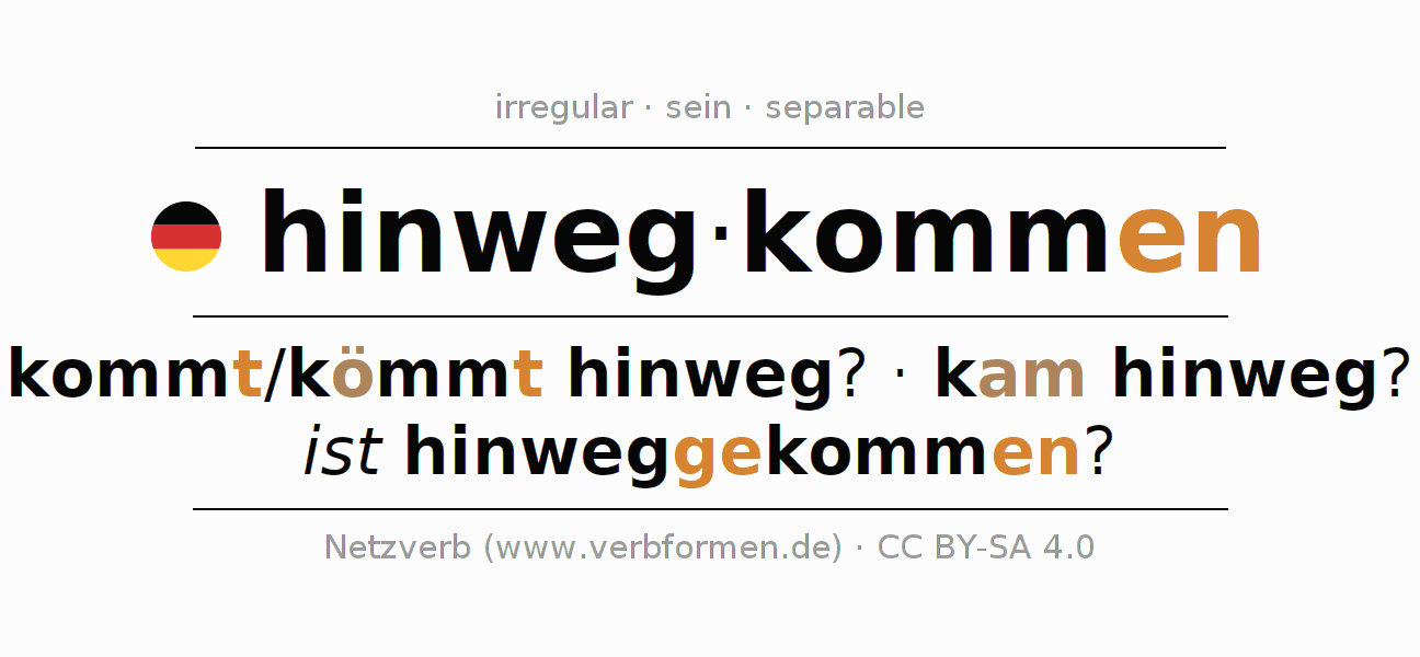 Worksheets are used generally for the conjugation of the verb hinwegkommen in teaching. The materials can be used as Open Educational Resources (OER) for exercises, for games and as Tasks (CC BY-SA 4.0). There are many different types of tasks available for the verb hinwegkommen. These are overview sheets with complete conjugation, puzzles and games that require joint learning. The entire educational material is available for free as a PDF download, as pictures and as an interactive browser version. In addition to the tasks, countless examples for hinwegkommen also provide an aid to using the verb.