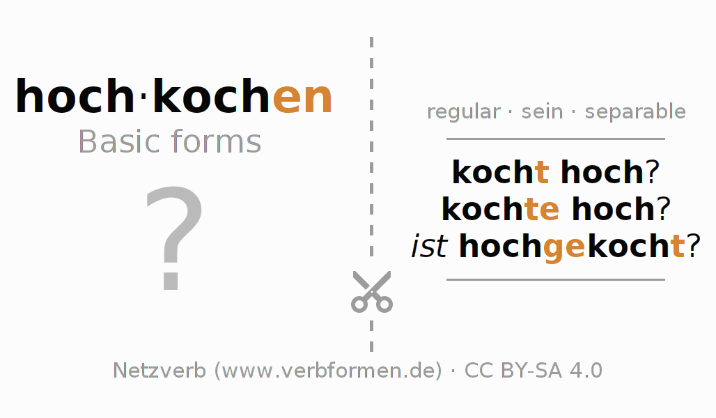 Worksheets are used generally for the conjugation of the verb hochkochen in teaching. The materials can be used as Open Educational Resources (OER) for exercises, for games and as Tasks (CC BY-SA 4.0). There are many different types of tasks available for the verb hochkochen. These are overview sheets with complete conjugation, puzzles and games that require joint learning. The entire educational material is available for free as a PDF download, as pictures and as an interactive browser version. In addition to the tasks, countless examples for hochkochen also provide an aid to using the verb.