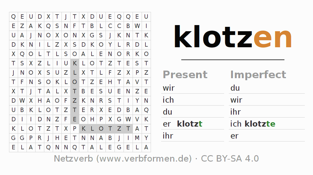 With these search word puzzles you can learn the conjugation of the German verb klotzen.