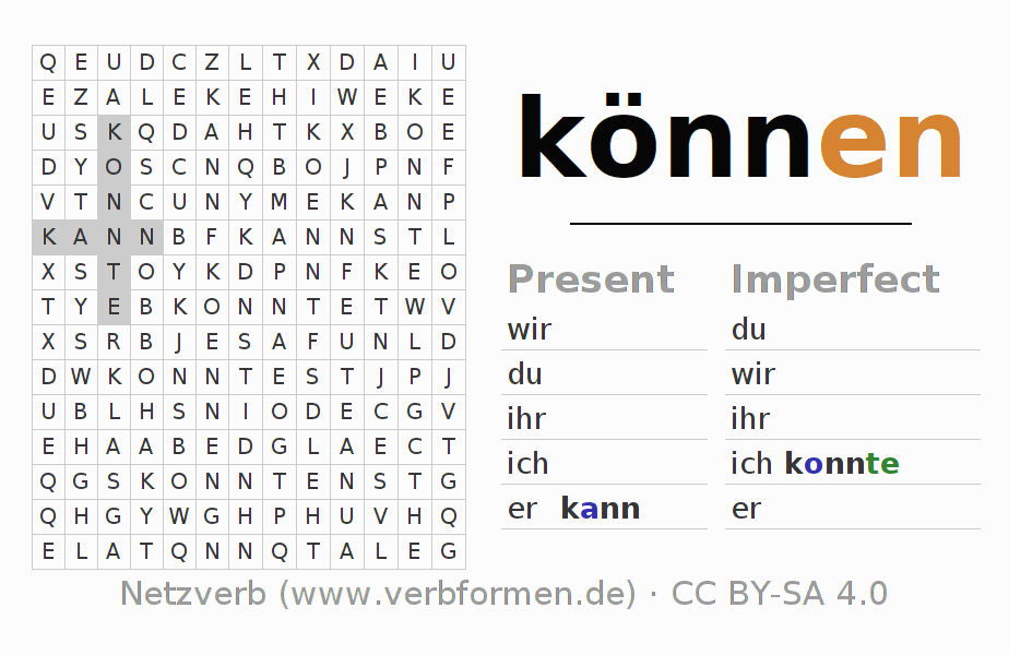 With these search word puzzles you can learn the conjugation of the German verb können.