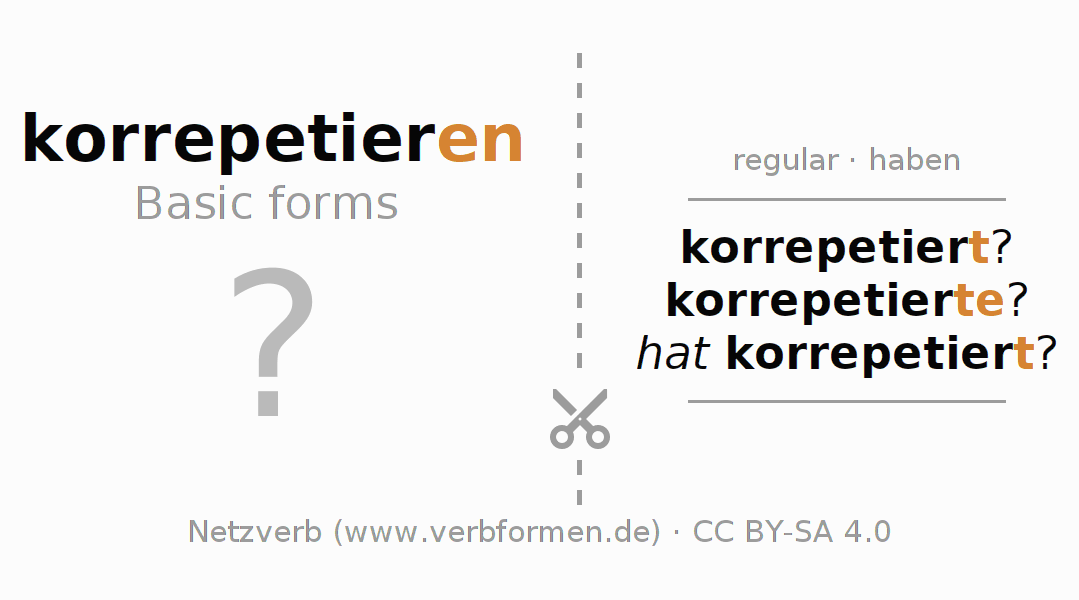 Worksheets are used generally for the conjugation of the verb korrepetieren in teaching. The materials can be used as Open Educational Resources (OER) for exercises, for games and as Tasks (CC BY-SA 4.0). There are many different types of tasks available for the verb korrepetieren. These are overview sheets with complete conjugation, puzzles and games that require joint learning. The entire educational material is available for free as a PDF download, as pictures and as an interactive browser version. In addition to the tasks, countless examples for korrepetieren also provide an aid to using the verb.