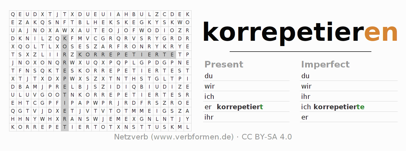 With these search word puzzles you can learn the conjugation of the German verb korrepetieren.