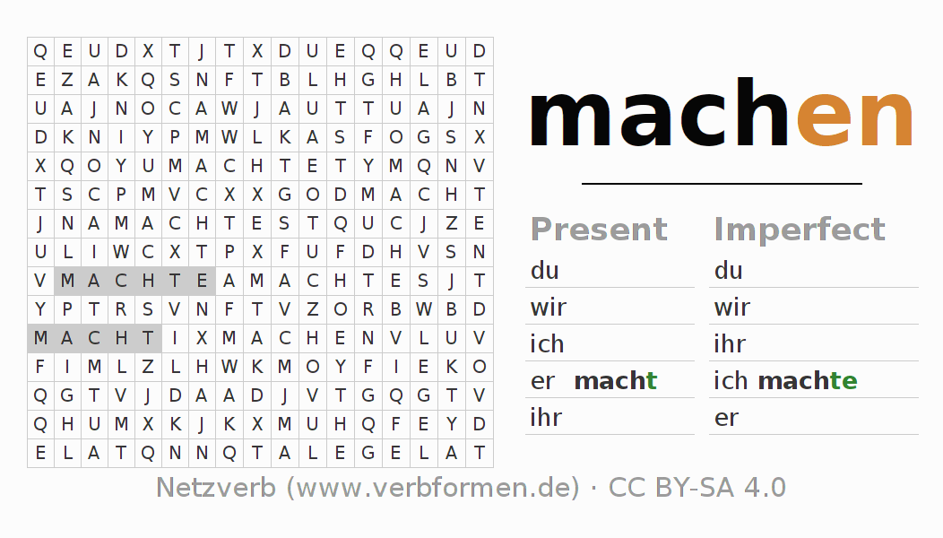 With these search word puzzles you can learn the conjugation of the German verb machen.