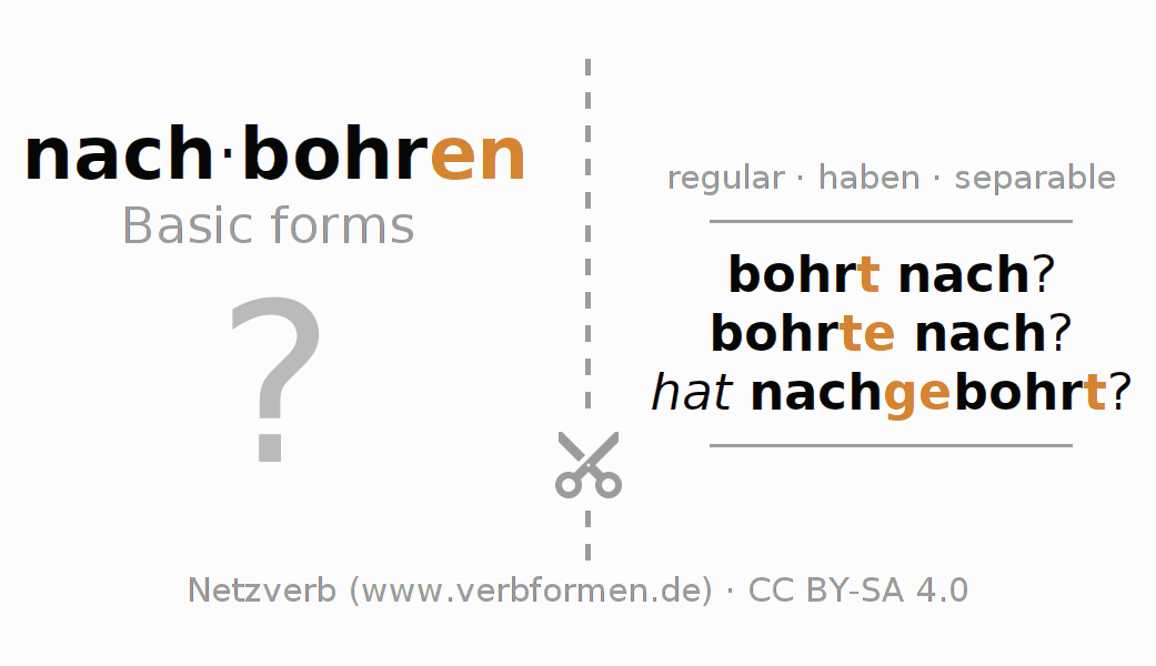 Worksheets are used generally for the conjugation of the verb nachbohren in teaching. The materials can be used as Open Educational Resources (OER) for exercises, for games and as Tasks (CC BY-SA 4.0). There are many different types of tasks available for the verb nachbohren. These are overview sheets with complete conjugation, puzzles and games that require joint learning. The entire educational material is available for free as a PDF download, as pictures and as an interactive browser version. In addition to the tasks, countless examples for nachbohren also provide an aid to using the verb.