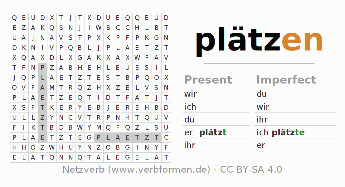 With these search word puzzles you can learn the conjugation of the German verb plätzen.