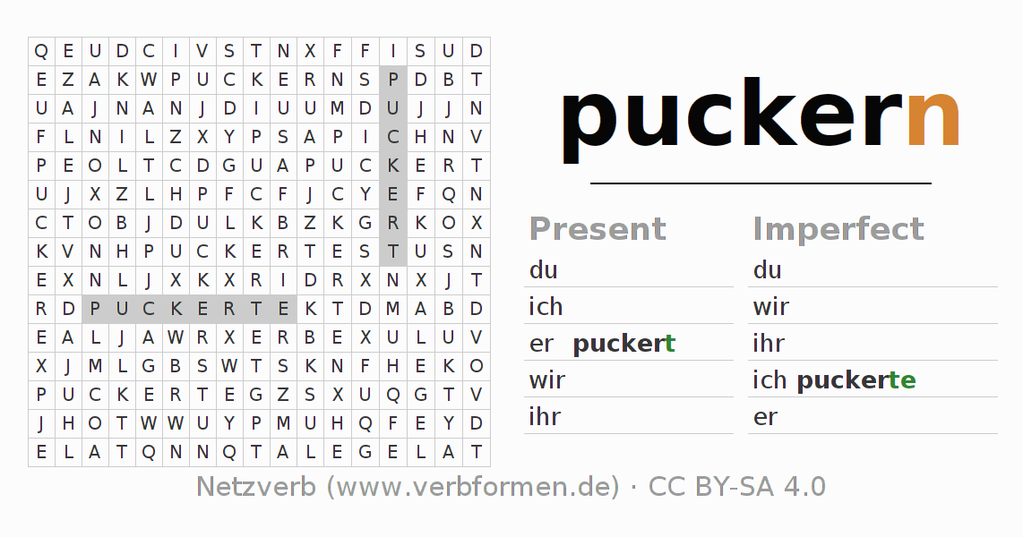 With these search word puzzles you can learn the conjugation of the German verb puckern.
