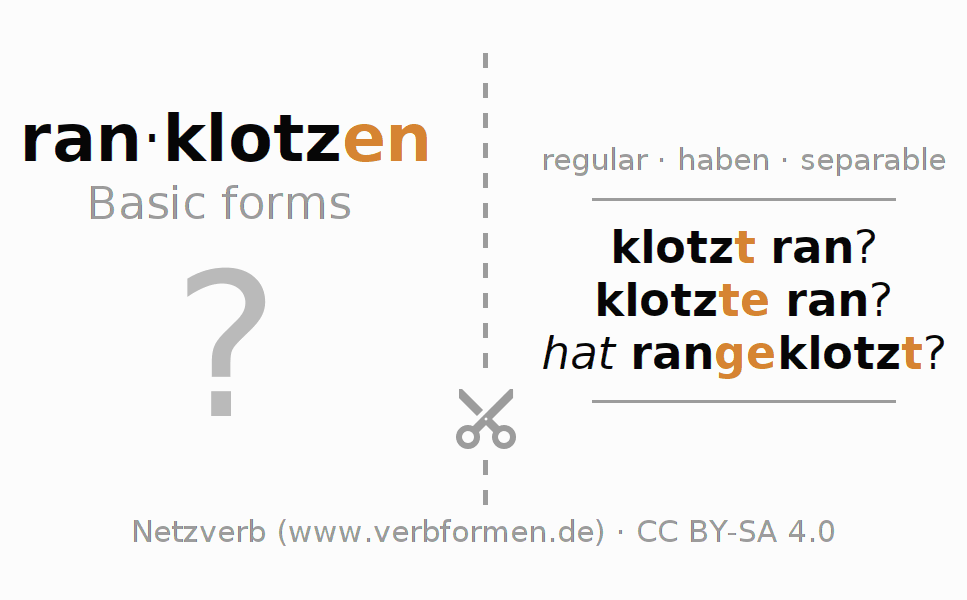 Worksheets are used generally for the conjugation of the verb ranklotzen in teaching. The materials can be used as Open Educational Resources (OER) for exercises, for games and as Tasks (CC BY-SA 4.0). There are many different types of tasks available for the verb ranklotzen. These are overview sheets with complete conjugation, puzzles and games that require joint learning. The entire educational material is available for free as a PDF download, as pictures and as an interactive browser version. In addition to the tasks, countless examples for ranklotzen also provide an aid to using the verb.