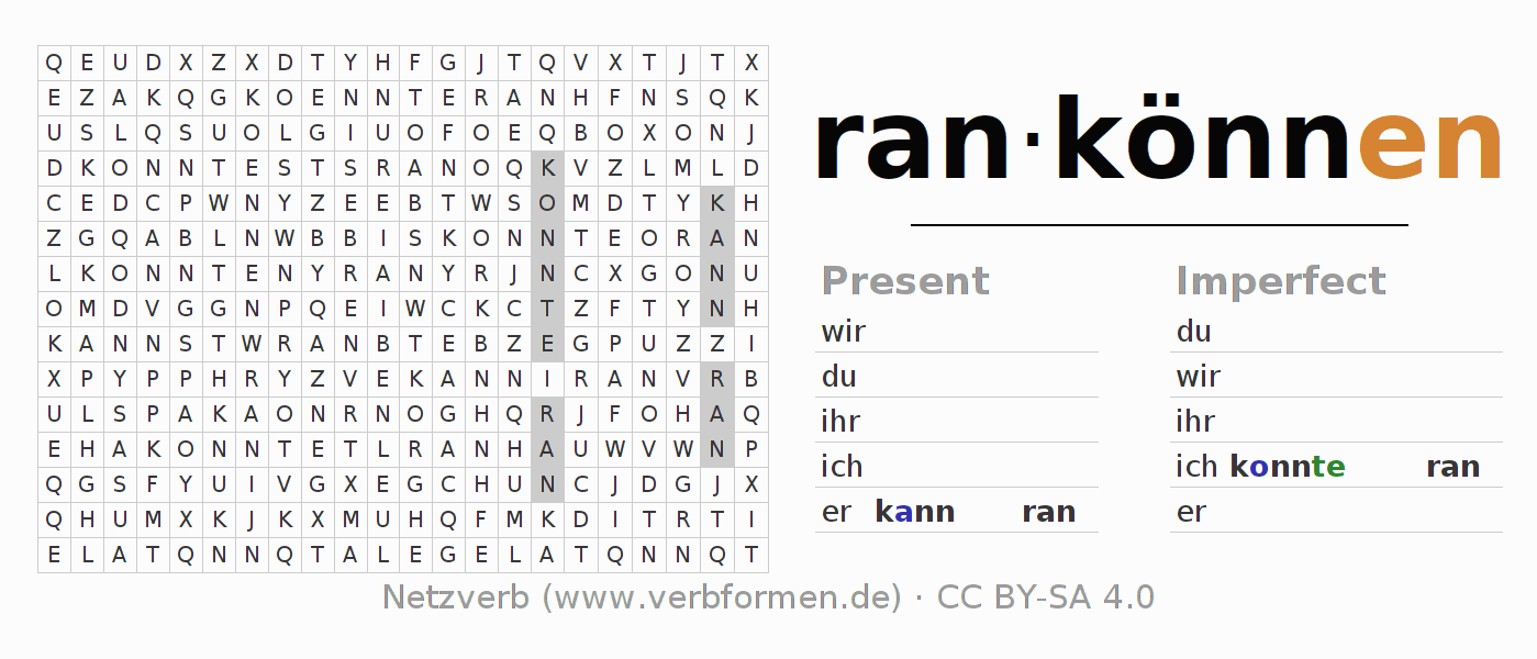 With these search word puzzles you can learn the conjugation of the German verb rankönnen.