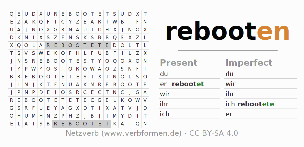 With these search word puzzles you can learn the conjugation of the German verb rebooten.