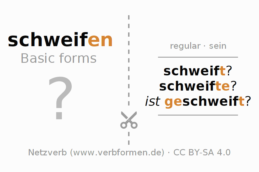 Worksheets are used generally for the conjugation of the verb schweifen in teaching. The materials can be used as Open Educational Resources (OER) for exercises, for games and as Tasks (CC BY-SA 4.0). There are many different types of tasks available for the verb schweifen (ist). These are overview sheets with complete conjugation, puzzles and games that require joint learning. The entire educational material is available for free as a PDF download, as pictures and as an interactive browser version. In addition to the tasks, countless examples for schweifen also provide an aid to using the verb.