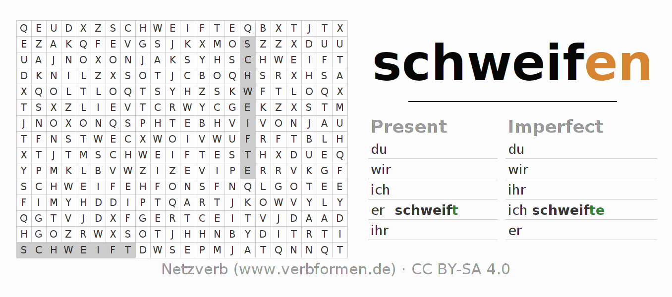 With these search word puzzles you can learn the conjugation of the German verb schweifen.