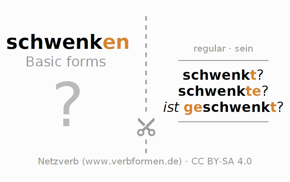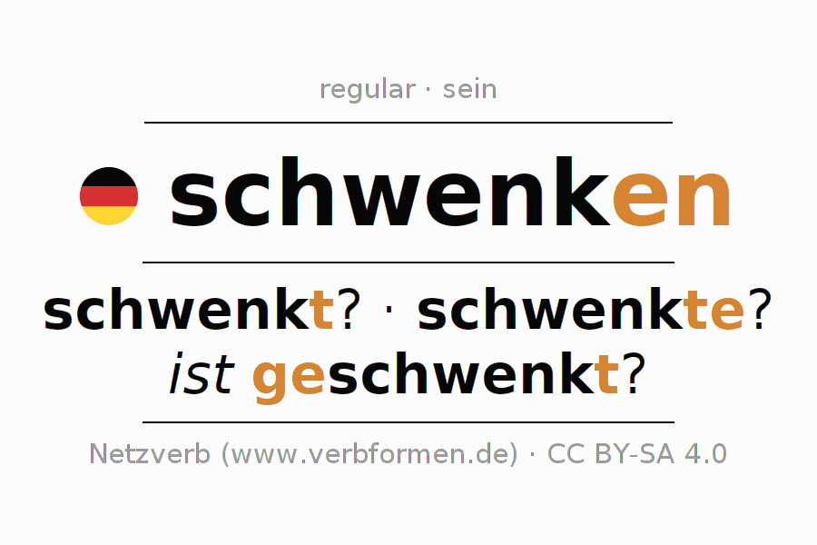 Worksheets are used generally for the conjugation of the verb schwenken in teaching. The materials can be used as Open Educational Resources (OER) for exercises, for games and as Tasks (CC BY-SA 4.0). There are many different types of tasks available for the verb schwenken (ist). These are overview sheets with complete conjugation, puzzles and games that require joint learning. The entire educational material is available for free as a PDF download, as pictures and as an interactive browser version. In addition to the tasks, countless examples for schwenken also provide an aid to using the verb.