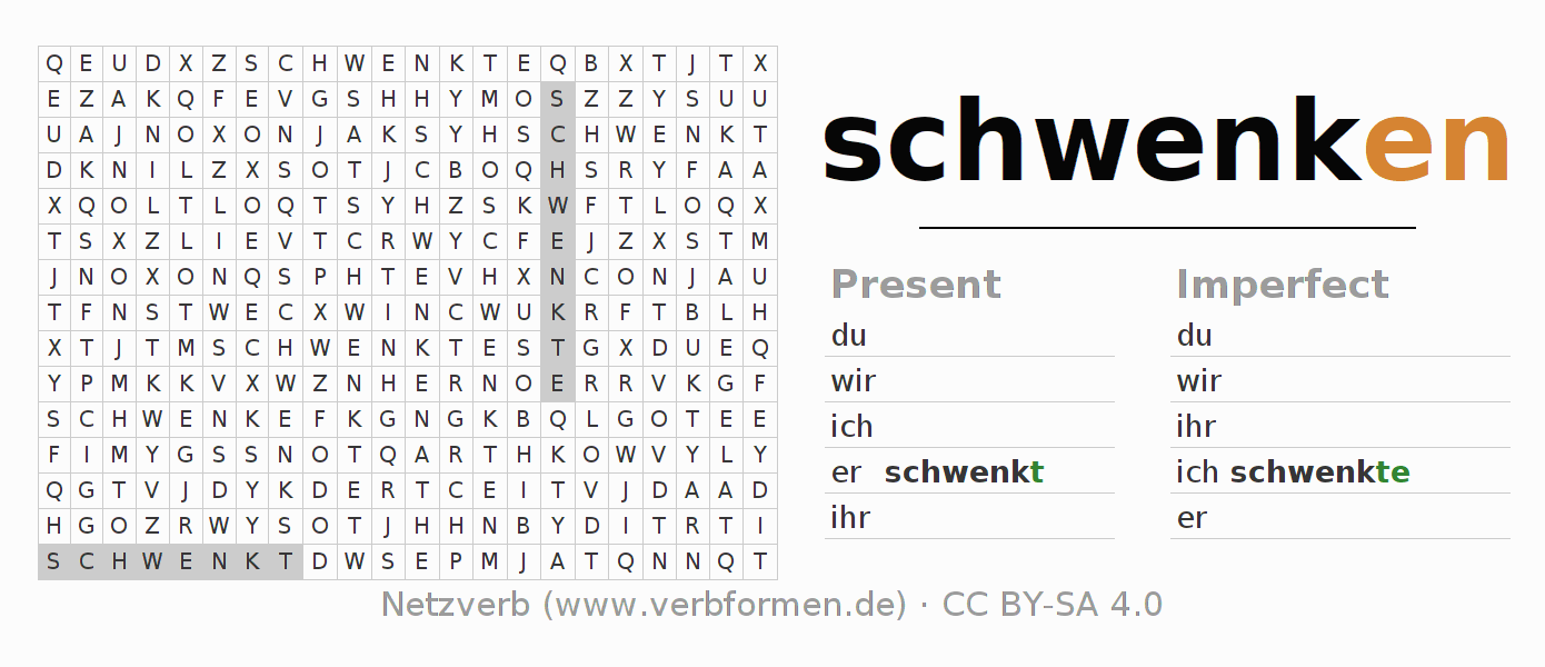 With these search word puzzles you can learn the conjugation of the German verb schwenken.