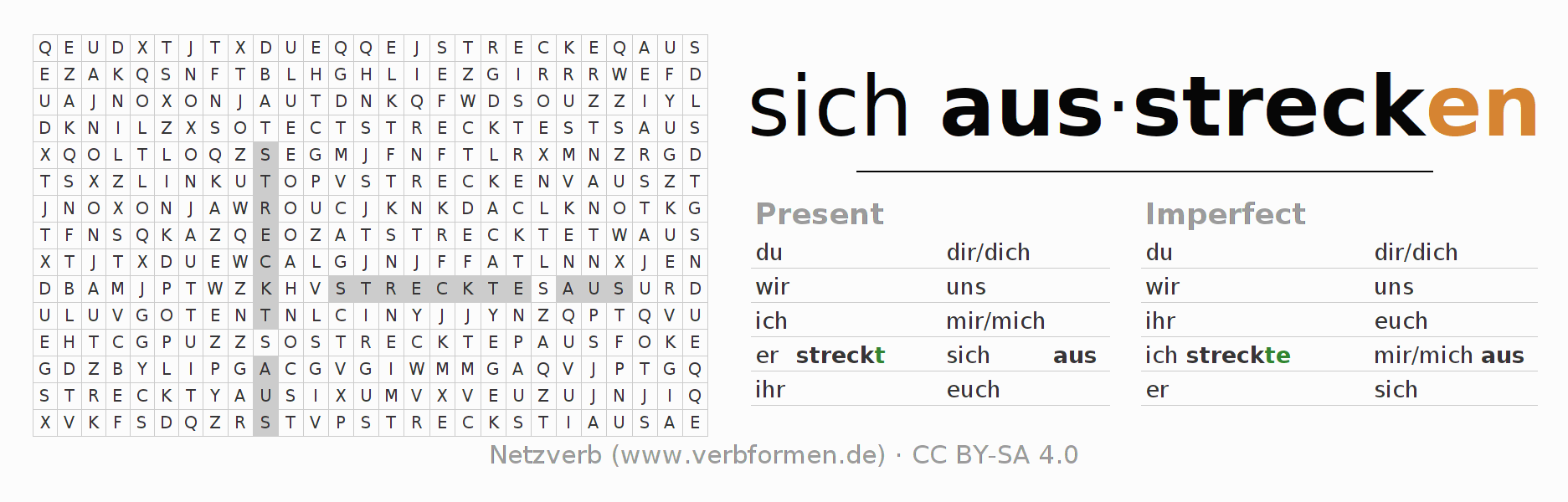 With these search word puzzles you can learn the conjugation of the German verb sich ausstrecken.