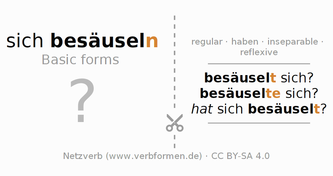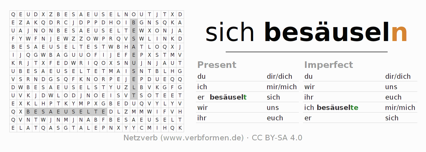 Worksheets are used generally for the conjugation of the verb besäuseln in teaching. The materials can be used as Open Educational Resources (OER) for exercises, for games and as Tasks (CC BY-SA 4.0). There are many different types of tasks available for the verb sich besäuseln. These are overview sheets with complete conjugation, puzzles and games that require joint learning. The entire educational material is available for free as a PDF download, as pictures and as an interactive browser version. In addition to the tasks, countless examples for besäuseln also provide an aid to using the verb.