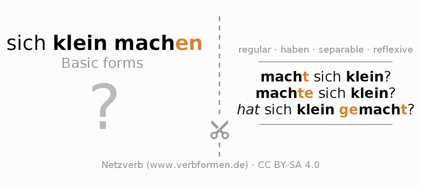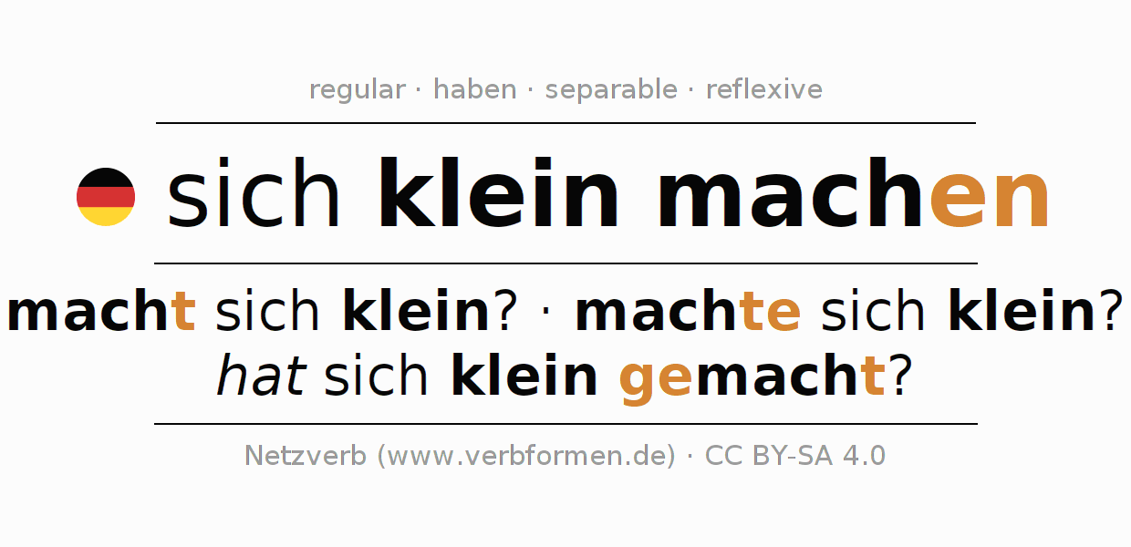 Worksheets are used generally for the conjugation of the verb kleinmachen in teaching. The materials can be used as Open Educational Resources (OER) for exercises, for games and as Tasks (CC BY-SA 4.0). There are many different types of tasks available for the verb sich kleinmachen. These are overview sheets with complete conjugation, puzzles and games that require joint learning. The entire educational material is available for free as a PDF download, as pictures and as an interactive browser version. In addition to the tasks, countless examples for kleinmachen also provide an aid to using the verb.