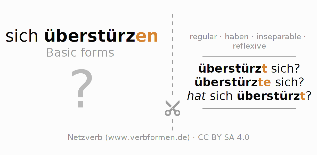 Worksheets are used generally for the conjugation of the verb überstürzen in teaching. The materials can be used as Open Educational Resources (OER) for exercises, for games and as Tasks (CC BY-SA 4.0). There are many different types of tasks available for the verb sich überstürzen. These are overview sheets with complete conjugation, puzzles and games that require joint learning. The entire educational material is available for free as a PDF download, as pictures and as an interactive browser version. In addition to the tasks, countless examples for überstürzen also provide an aid to using the verb.