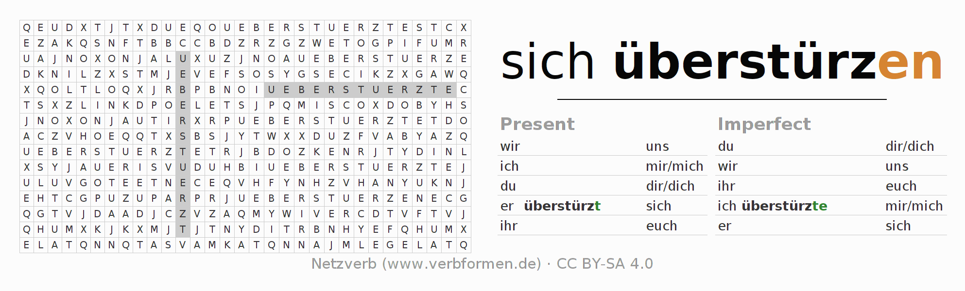 With these search word puzzles you can learn the conjugation of the German verb sich überstürzen.