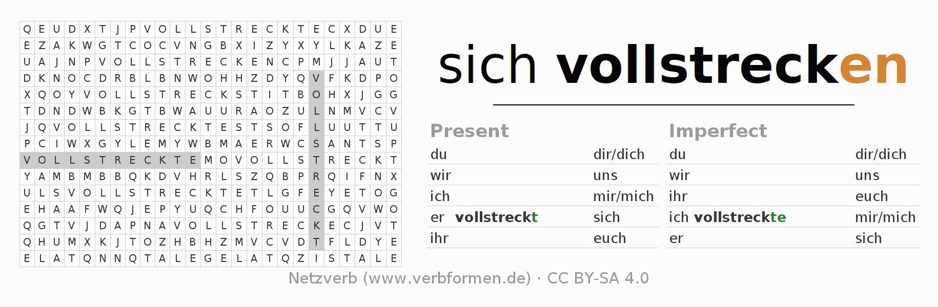 Worksheets are used generally for the conjugation of the verb vollstrecken in teaching. The materials can be used as Open Educational Resources (OER) for exercises, for games and as Tasks (CC BY-SA 4.0). There are many different types of tasks available for the verb sich vollstrecken. These are overview sheets with complete conjugation, puzzles and games that require joint learning. The entire educational material is available for free as a PDF download, as pictures and as an interactive browser version. In addition to the tasks, countless examples for vollstrecken also provide an aid to using the verb.