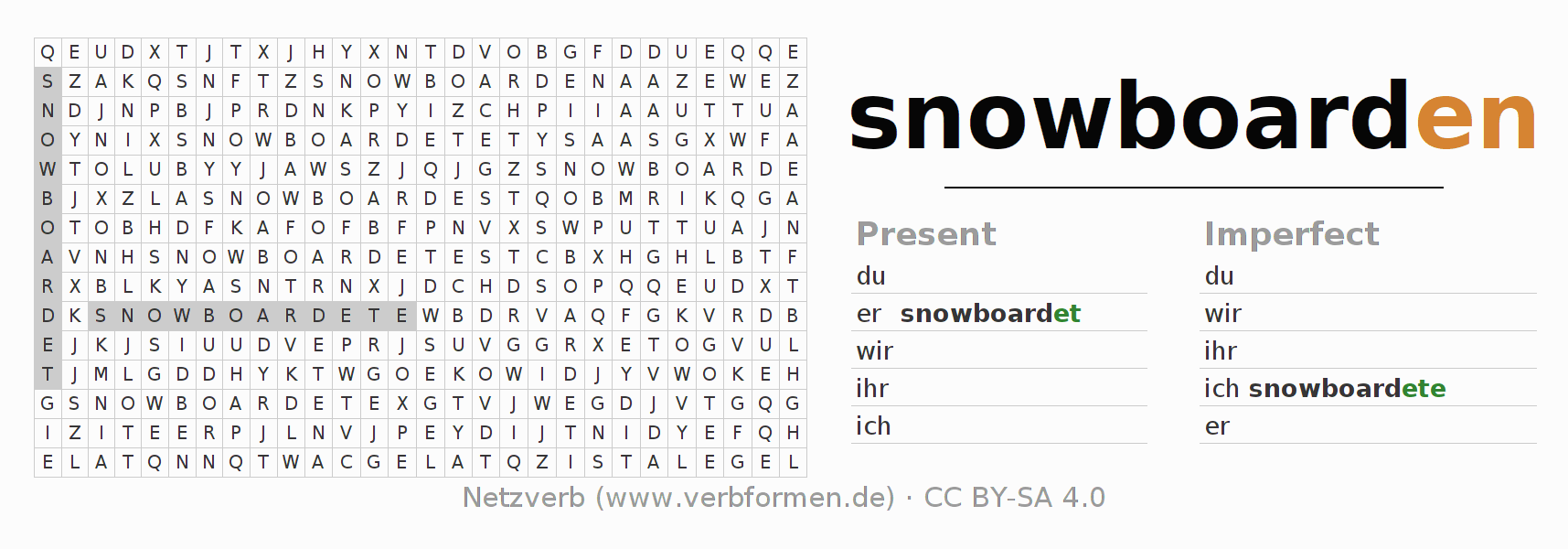 Worksheets are used generally for the conjugation of the verb snowboarden in teaching. The materials can be used as Open Educational Resources (OER) for exercises, for games and as Tasks (CC BY-SA 4.0). There are many different types of tasks available for the verb snowboarden (hat). These are overview sheets with complete conjugation, puzzles and games that require joint learning. The entire educational material is available for free as a PDF download, as pictures and as an interactive browser version. In addition to the tasks, countless examples for snowboarden also provide an aid to using the verb.