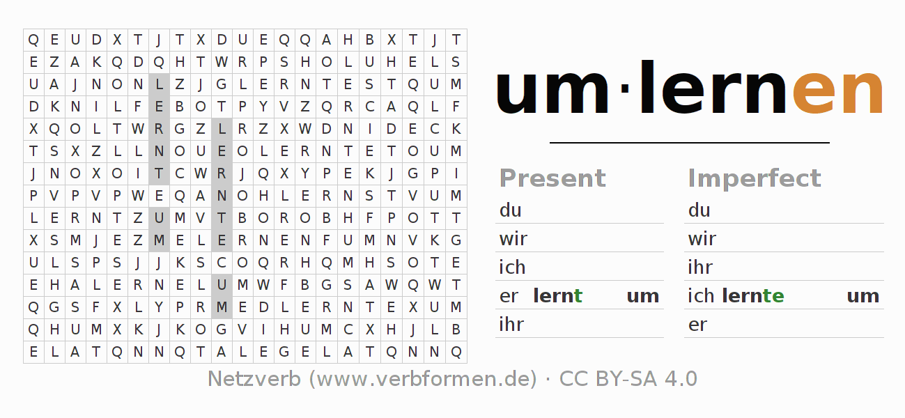 With these search word puzzles you can learn the conjugation of the German verb umlernen.