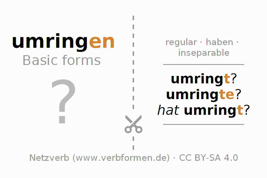 Worksheets are used generally for the conjugation of the verb umringen in teaching. The materials can be used as Open Educational Resources (OER) for exercises, for games and as Tasks (CC BY-SA 4.0). There are many different types of tasks available for the verb umringen. These are overview sheets with complete conjugation, puzzles and games that require joint learning. The entire educational material is available for free as a PDF download, as pictures and as an interactive browser version. In addition to the tasks, countless examples for umringen also provide an aid to using the verb.