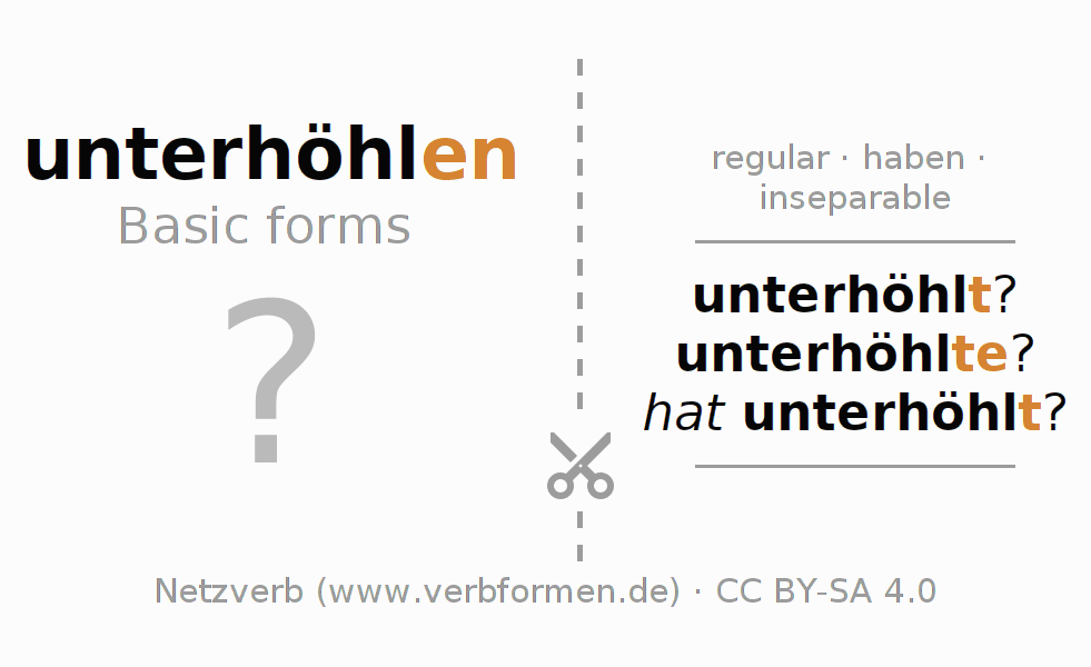 Worksheets are used generally for the conjugation of the verb unterhöhlen in teaching. The materials can be used as Open Educational Resources (OER) for exercises, for games and as Tasks (CC BY-SA 4.0). There are many different types of tasks available for the verb unterhöhlen. These are overview sheets with complete conjugation, puzzles and games that require joint learning. The entire educational material is available for free as a PDF download, as pictures and as an interactive browser version. In addition to the tasks, countless examples for unterhöhlen also provide an aid to using the verb.