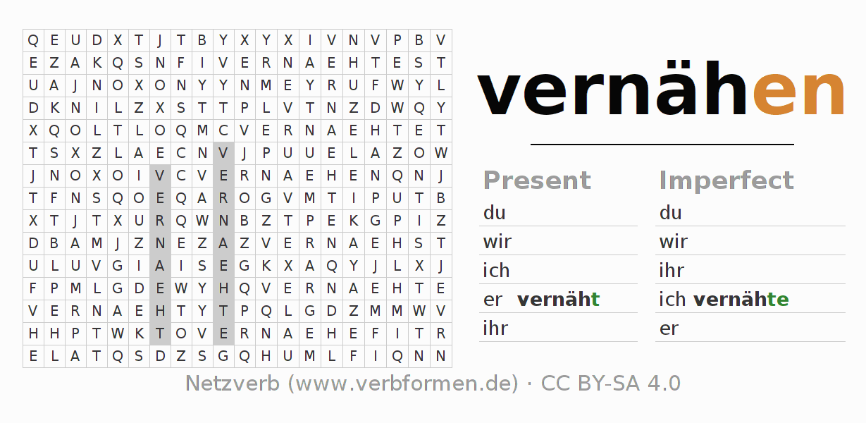 With these search word puzzles you can learn the conjugation of the German verb vernähen.