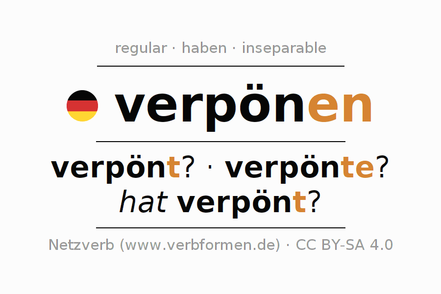 Worksheets are used generally for the conjugation of the verb verpönen in teaching. The materials can be used as Open Educational Resources (OER) for exercises, for games and as Tasks (CC BY-SA 4.0). There are many different types of tasks available for the verb verpönen. These are overview sheets with complete conjugation, puzzles and games that require joint learning. The entire educational material is available for free as a PDF download, as pictures and as an interactive browser version. In addition to the tasks, countless examples for verpönen also provide an aid to using the verb.
