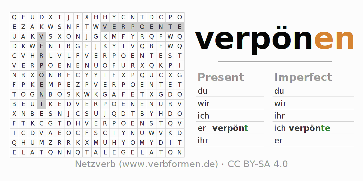 With these search word puzzles you can learn the conjugation of the German verb verpönen.