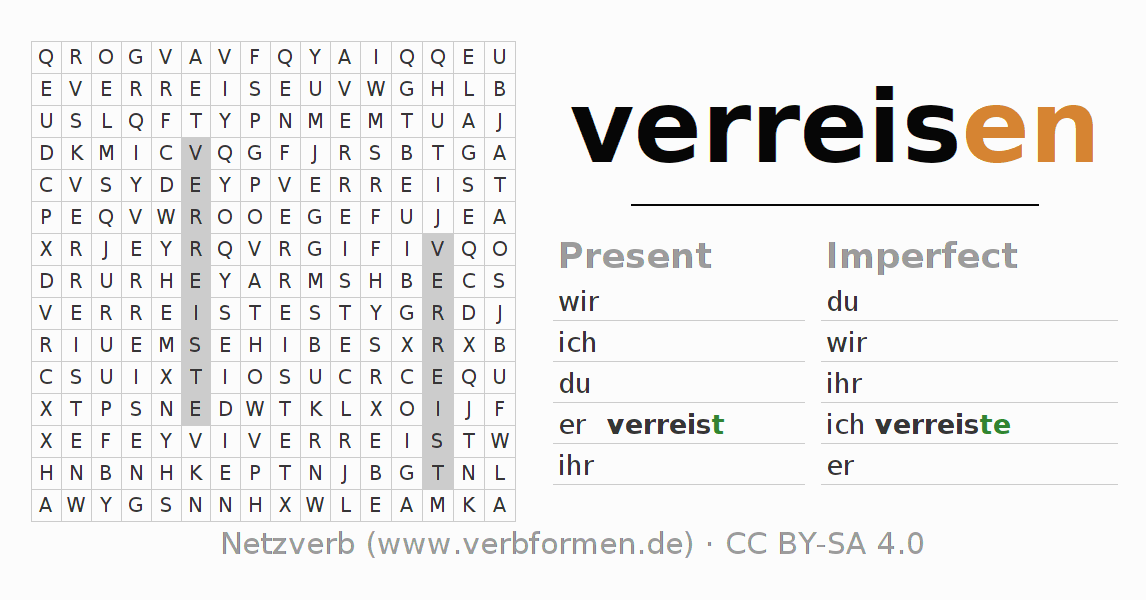With these search word puzzles you can learn the conjugation of the German verb verreisen.