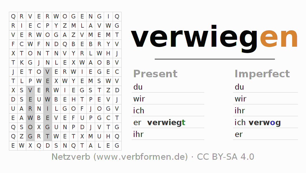 Worksheets are used generally for the conjugation of the verb verwiegen in teaching. The materials can be used as Open Educational Resources (OER) for exercises, for games and as Tasks (CC BY-SA 4.0). There are many different types of tasks available for the verb verwiegen. These are overview sheets with complete conjugation, puzzles and games that require joint learning. The entire educational material is available for free as a PDF download, as pictures and as an interactive browser version. In addition to the tasks, countless examples for verwiegen also provide an aid to using the verb.