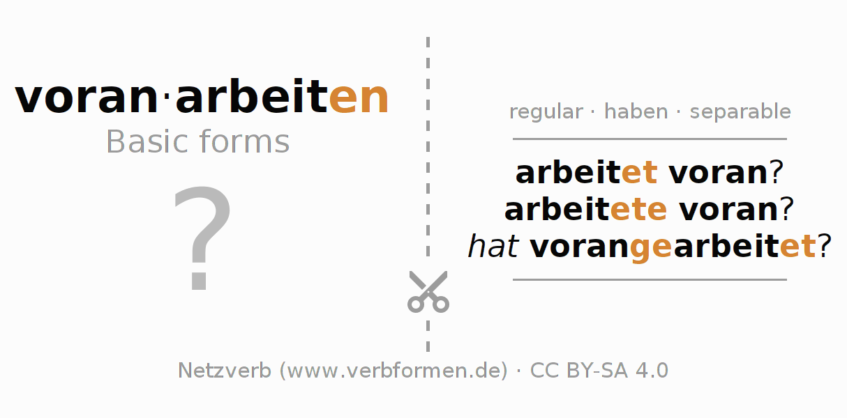 Worksheets are used generally for the conjugation of the verb voranarbeiten in teaching. The materials can be used as Open Educational Resources (OER) for exercises, for games and as Tasks (CC BY-SA 4.0). There are many different types of tasks available for the verb voranarbeiten. These are overview sheets with complete conjugation, puzzles and games that require joint learning. The entire educational material is available for free as a PDF download, as pictures and as an interactive browser version. In addition to the tasks, countless examples for voranarbeiten also provide an aid to using the verb.