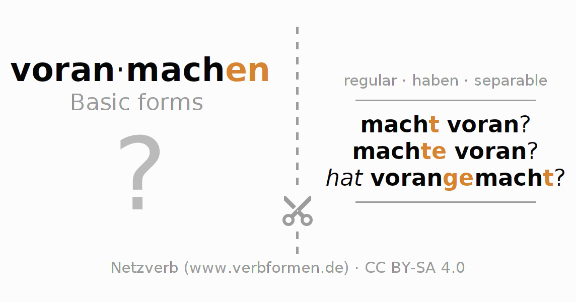 Worksheets are used generally for the conjugation of the verb voranmachen in teaching. The materials can be used as Open Educational Resources (OER) for exercises, for games and as Tasks (CC BY-SA 4.0). There are many different types of tasks available for the verb voranmachen. These are overview sheets with complete conjugation, puzzles and games that require joint learning. The entire educational material is available for free as a PDF download, as pictures and as an interactive browser version. In addition to the tasks, countless examples for voranmachen also provide an aid to using the verb.