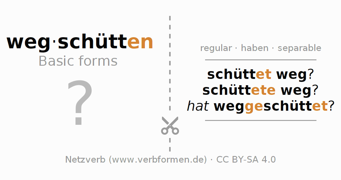 Worksheets are used generally for the conjugation of the verb wegschütten in teaching. The materials can be used as Open Educational Resources (OER) for exercises, for games and as Tasks (CC BY-SA 4.0). There are many different types of tasks available for the verb wegschütten. These are overview sheets with complete conjugation, puzzles and games that require joint learning. The entire educational material is available for free as a PDF download, as pictures and as an interactive browser version. In addition to the tasks, countless examples for wegschütten also provide an aid to using the verb.