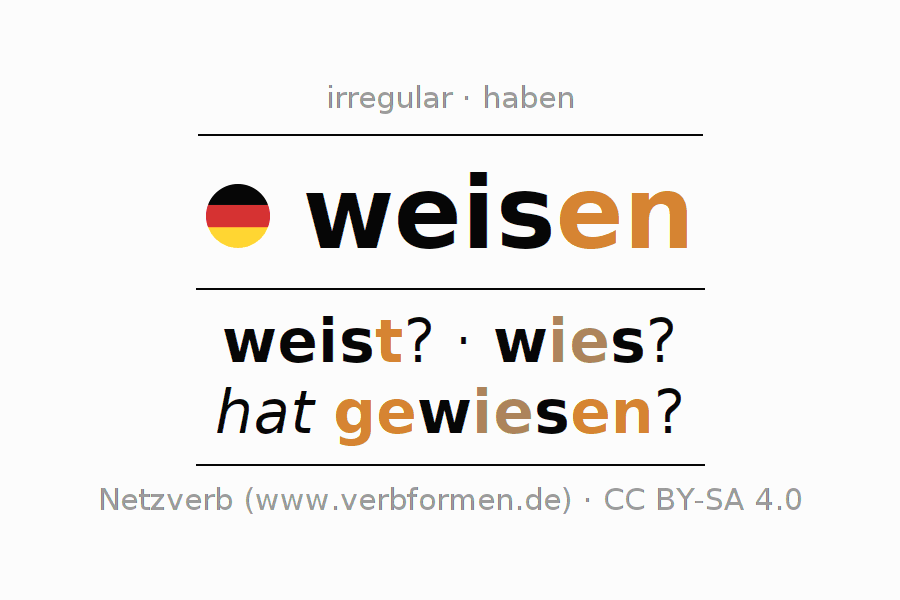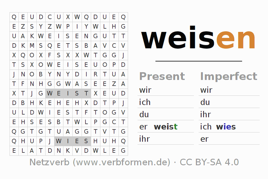 Worksheets are used generally for the conjugation of the verb weisen in teaching. The materials can be used as Open Educational Resources (OER) for exercises, for games and as Tasks (CC BY-SA 4.0). There are many different types of tasks available for the verb weisen. These are overview sheets with complete conjugation, puzzles and games that require joint learning. The entire educational material is available for free as a PDF download, as pictures and as an interactive browser version. In addition to the tasks, countless examples for weisen also provide an aid to using the verb.