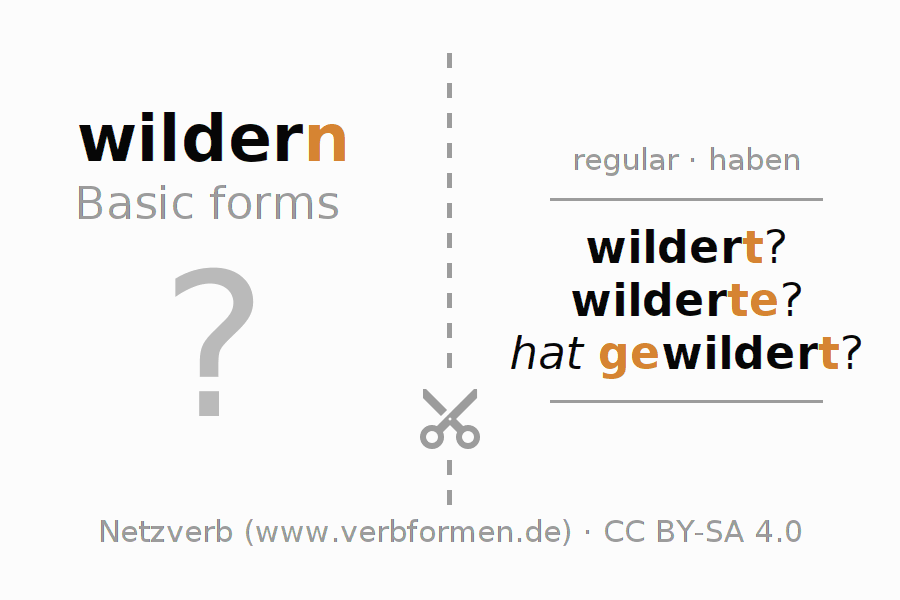 Worksheets are used generally for the conjugation of the verb wildern in teaching. The materials can be used as Open Educational Resources (OER) for exercises, for games and as Tasks (CC BY-SA 4.0). There are many different types of tasks available for the verb wildern. These are overview sheets with complete conjugation, puzzles and games that require joint learning. The entire educational material is available for free as a PDF download, as pictures and as an interactive browser version. In addition to the tasks, countless examples for wildern also provide an aid to using the verb.