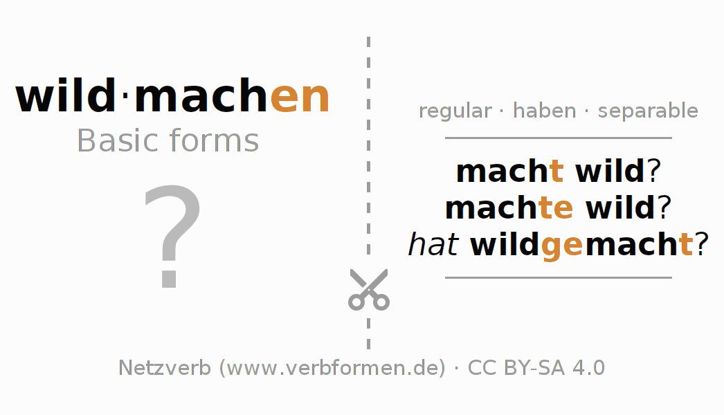 Worksheets are used generally for the conjugation of the verb wildmachen in teaching. The materials can be used as Open Educational Resources (OER) for exercises, for games and as Tasks (CC BY-SA 4.0). There are many different types of tasks available for the verb wildmachen. These are overview sheets with complete conjugation, puzzles and games that require joint learning. The entire educational material is available for free as a PDF download, as pictures and as an interactive browser version. In addition to the tasks, countless examples for wildmachen also provide an aid to using the verb.