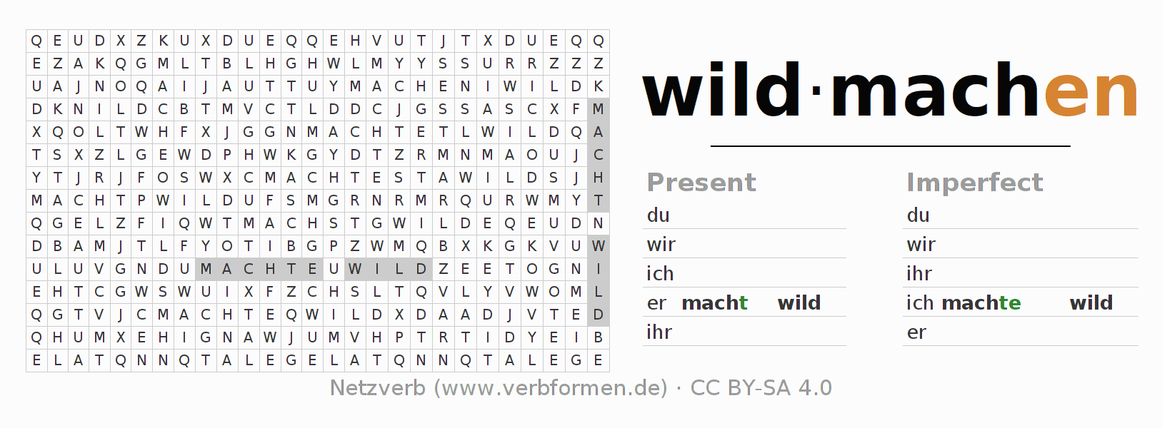 With these search word puzzles you can learn the conjugation of the German verb wildmachen.