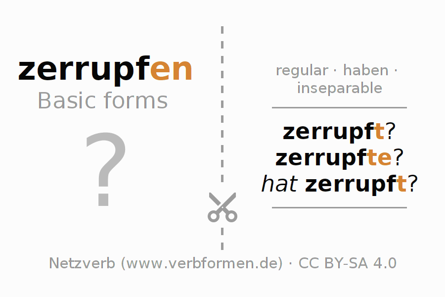Worksheets are used generally for the conjugation of the verb zerrupfen in teaching. The materials can be used as Open Educational Resources (OER) for exercises, for games and as Tasks (CC BY-SA 4.0). There are many different types of tasks available for the verb zerrupfen. These are overview sheets with complete conjugation, puzzles and games that require joint learning. The entire educational material is available for free as a PDF download, as pictures and as an interactive browser version. In addition to the tasks, countless examples for zerrupfen also provide an aid to using the verb.